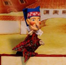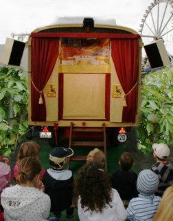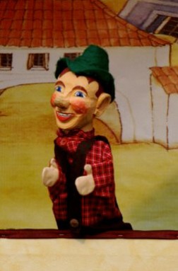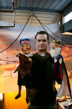 Während sich der PuppenspielerMario Osthold,hinter den Kulissenauf die Kinder vorbereitet ...